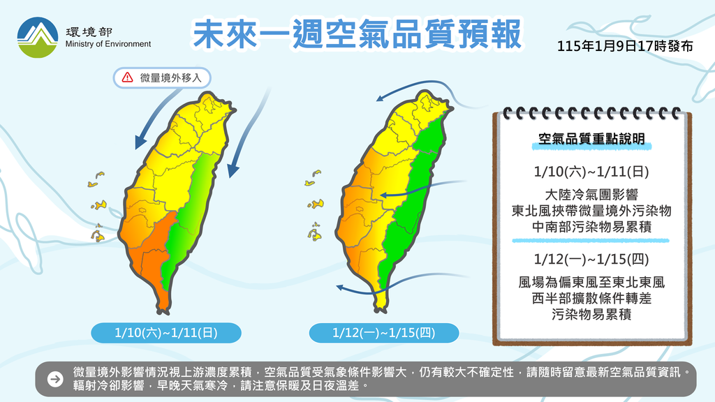 未來一週,10日至11日環境風場為東北風,東北風可能挾帶微量境外污染物影響臺灣及離島,中南部位於下風處,污染物易累積;12日至15日環境風場轉為偏東風至東北東風,西半部擴散條件轉差,污染物易累積。空氣品質受氣象條件影響大,有其不確定性,請隨時留意最新空氣品質資訊。